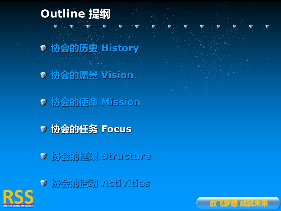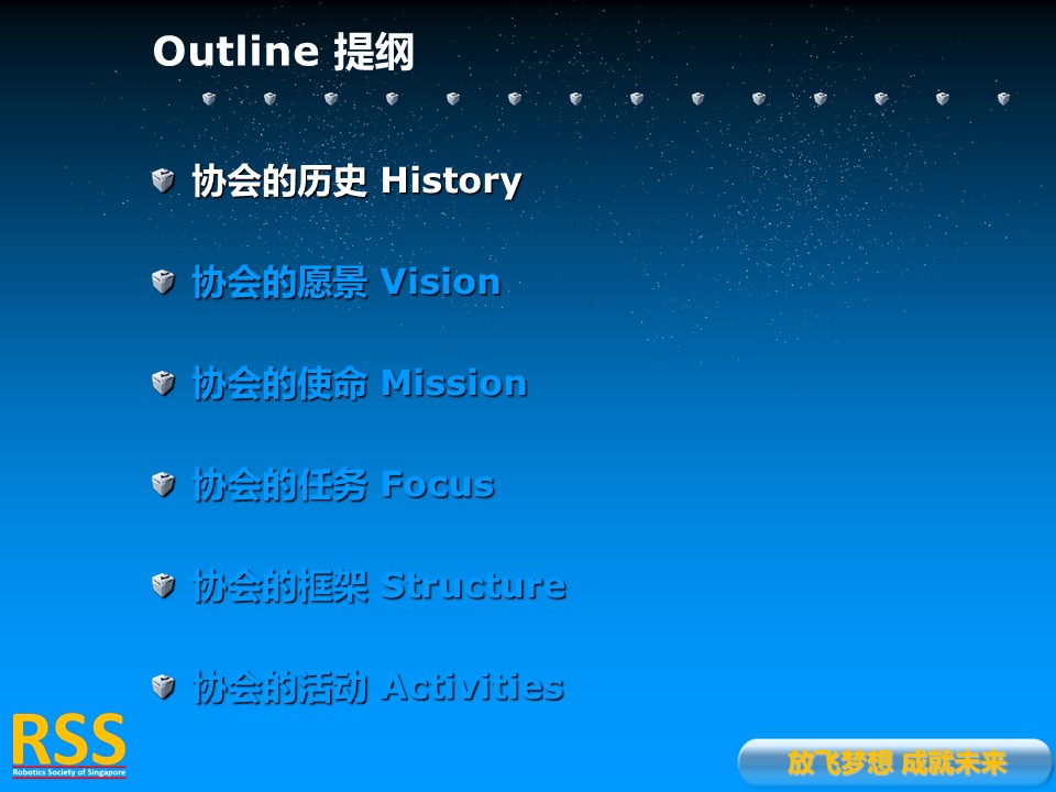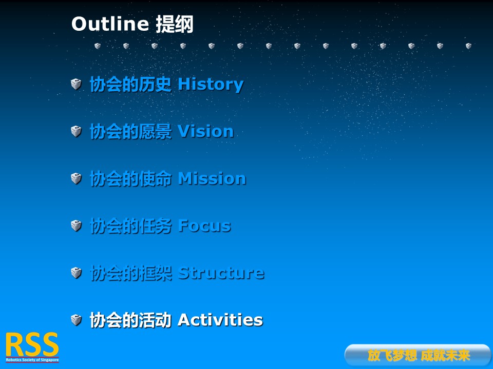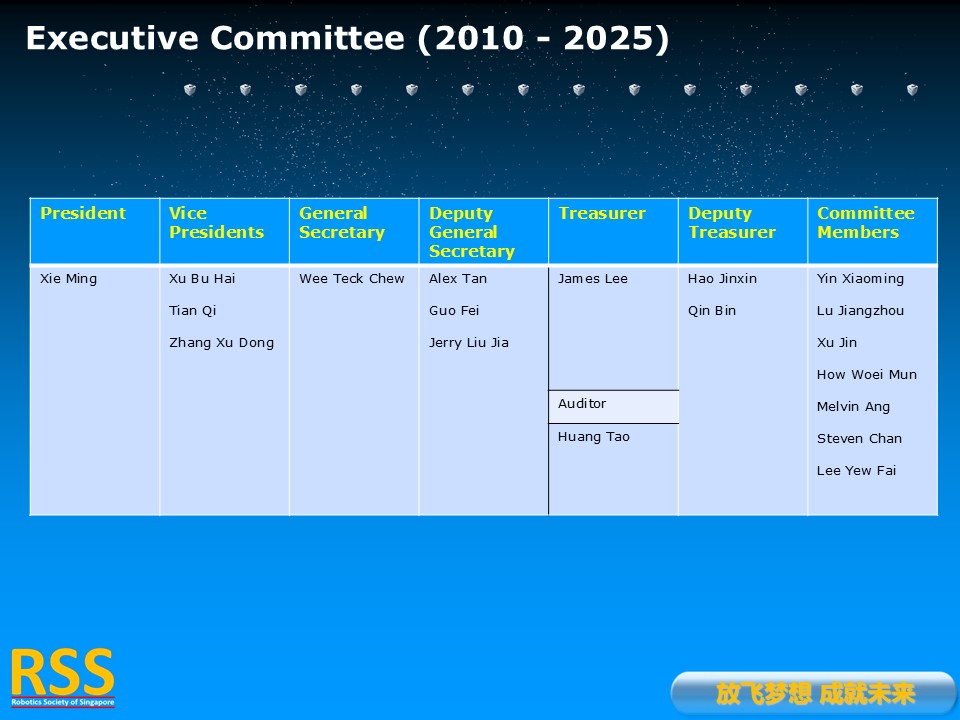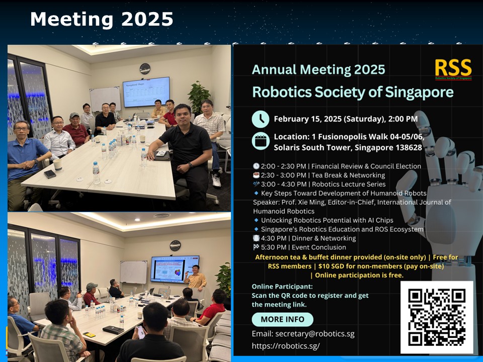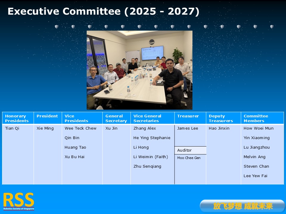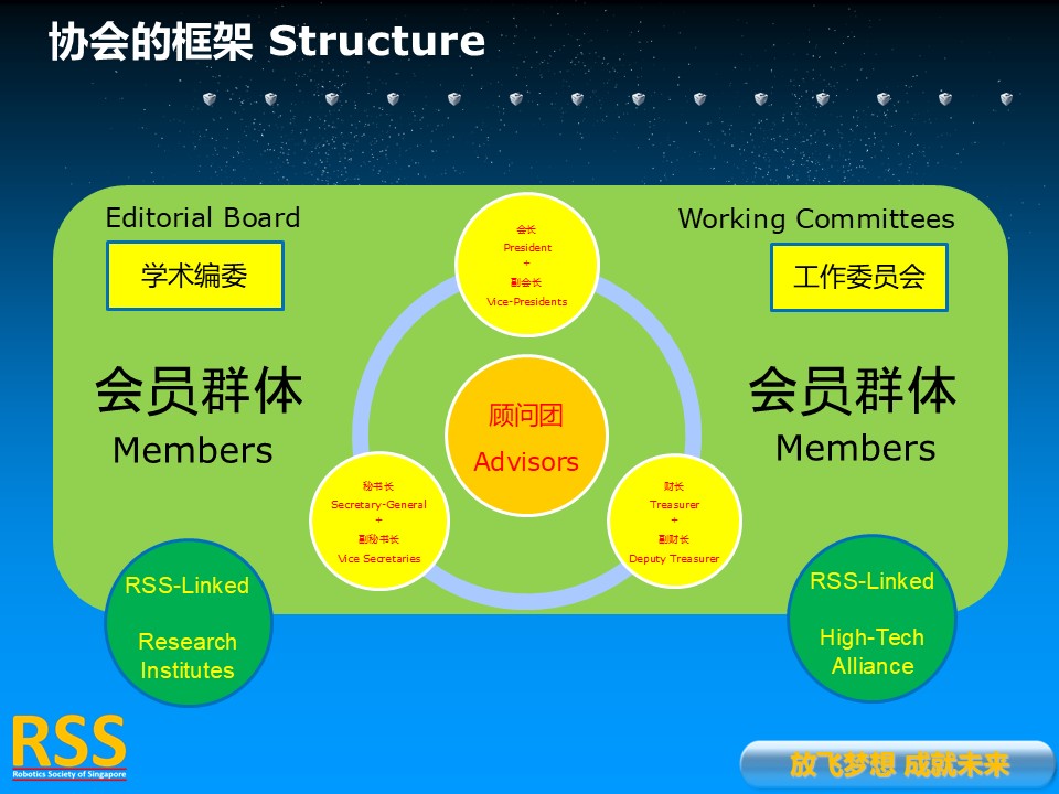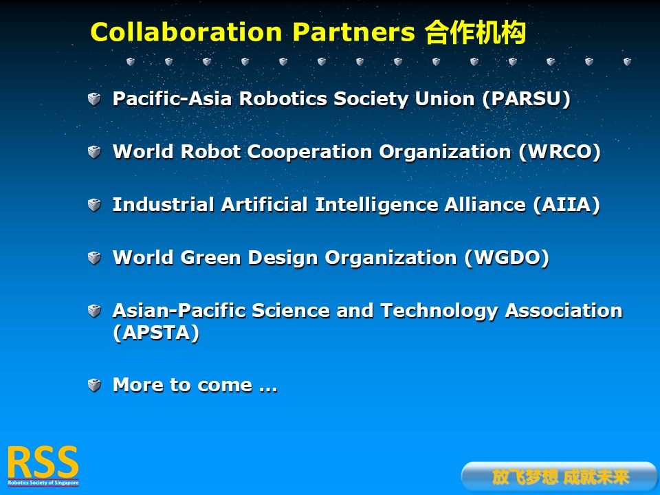 RSS is a Founding Member of Pacific-Asia Robotics Society Union as well as a Founding Member of World Robot Cooperation Organization. RSS is also in charge of the Singapore-China Alliance of Science and Technology.